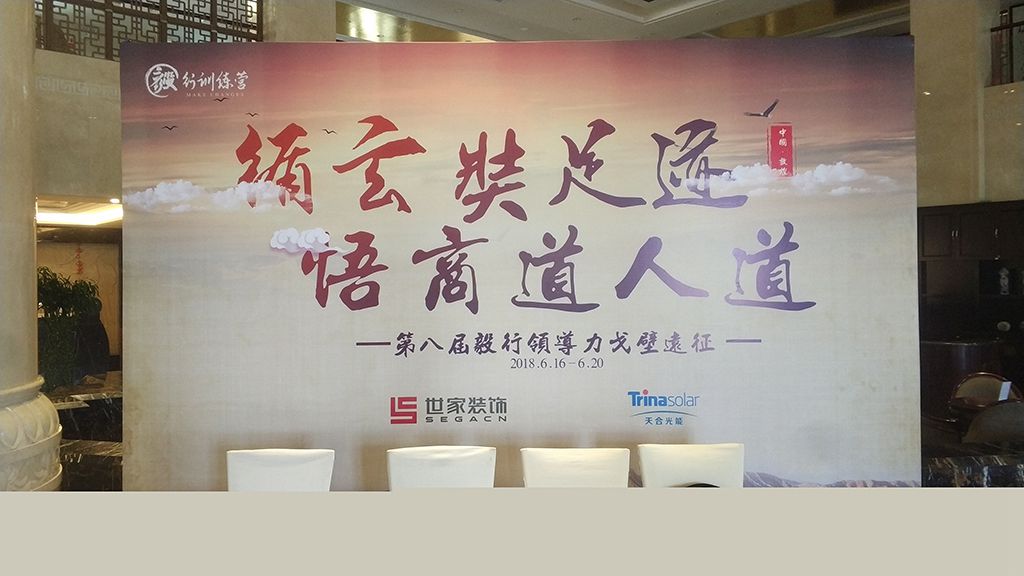 第八屆毅行領導力戈壁遠征,黑底寶麗布搭建簽到背景板,木制表寫真指示牌。